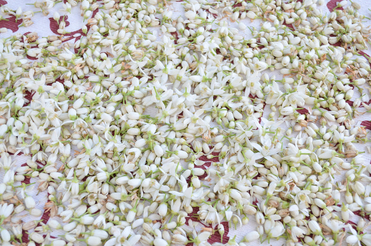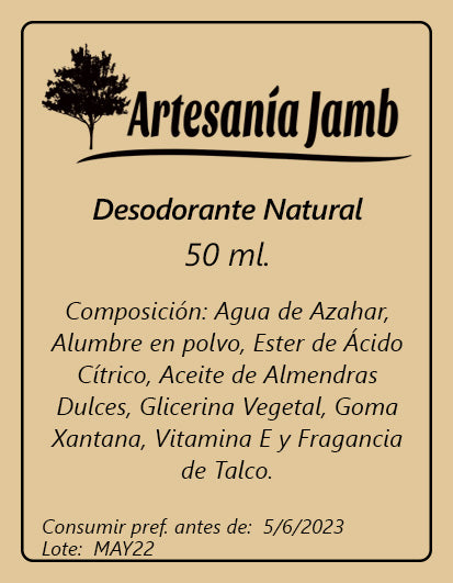 Agua de Azahar, alumbre en polvo, aceite de almendras, glicerina vegetal, goma de xantana, vitamina E, Fragancia de Talco, Albahaca y Menta.