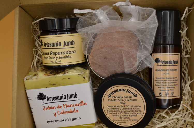 7. KIT PIEL SENSIBLE: CREMA REPARADORA + JABÓN DE CALÉNDULA + CHAMPÚ SÓLIDO CABELLO SECO Y SENSIBLE + DESODORANTE NATURAL DE TALCO.