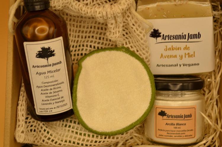 5. KIT LIMPIEZA TOTAL: AGUA MICELAR + 10 DISCOS DESMAQUILLANTES REUTILIZABLES DE ALGODON ECOLÓGICO + ARCILLA BLANCA + JABÓN AVENA Y MIEL.