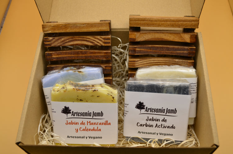1. KIT JABONES: 4 JABONES (ALOE VERA, LAVANDA, CARBÓN ACTIVADO Y CALÉNDULA) y 2 JABONERAS DE BAMBÚ elaboradas de forma artesanal.