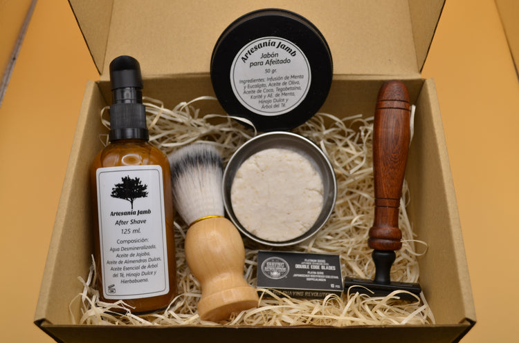 8. KIT DE AFEITADO: AFTER SHAVE NATURAL EN GEL + MAQUINILLA DE BARBERO TALLADA A MANO + 10 CUCHILLAS DE ALUMUNIO + JABÓN SÓLIDO PARA AFEITAR + BROCHA PARA AFEITADO DE PELO SUAVE.