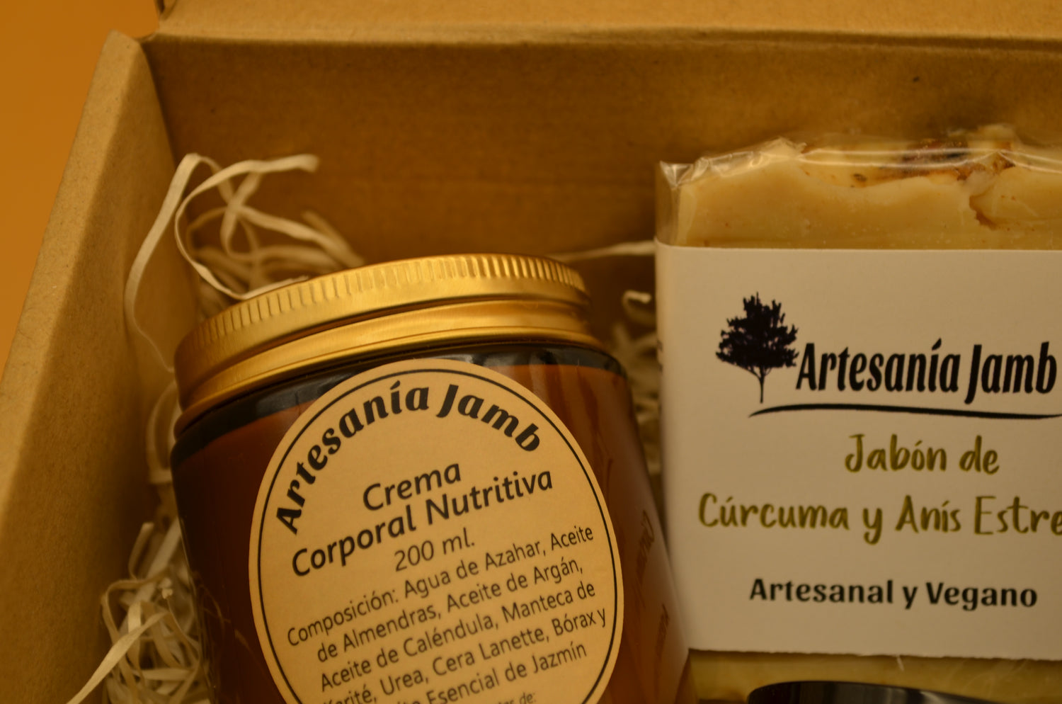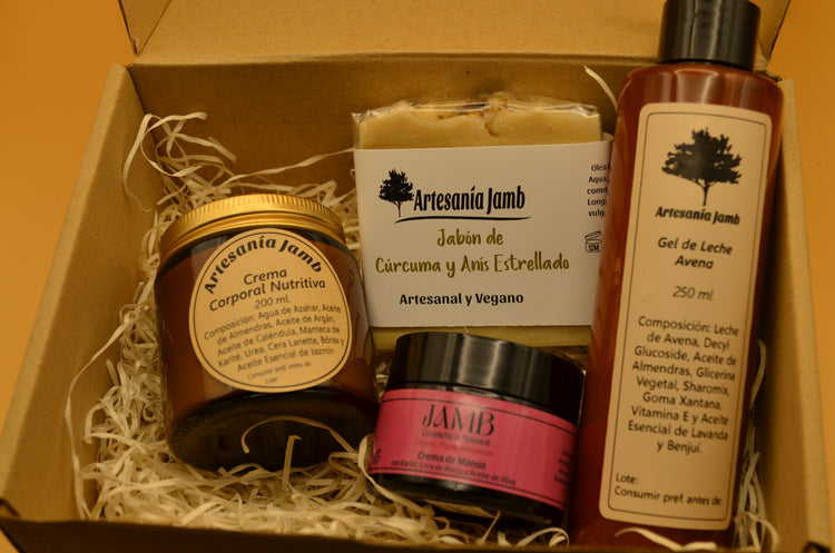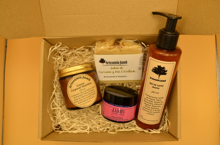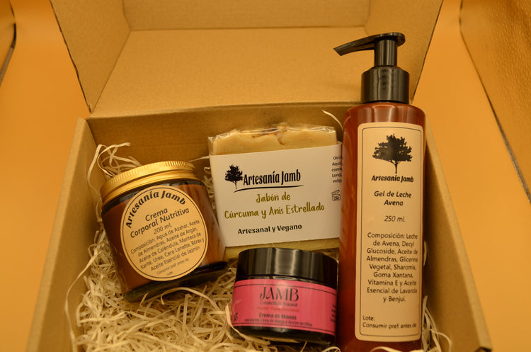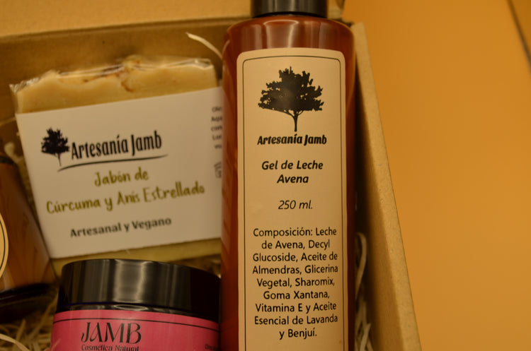 Este Kit está diseñado para los amantes del Ciudado Corporal, ya que combina algunos de productos nutritivos e hidratantes de nuestra tienda. Para abrir boca, hemos incluído uno de nuestros jabones más exóticos e interesantes como es el jabón de Cúrcuma y Anís Estrellado. Por todos son ya conocidas las grandes propiedades antioxidantes de la Cúrcuma, pero además la harina de Anís nos va a generar un efecto calmante y cicatrizante combinado con una exfoliación suave, que resulta ideal para eliminar las toxinas acumuladas en nuestros poros. Este jabón potencia la generación de colágeno y retrasa el umbral de oxidación de la piel gracias a las propiedades regenadoras de sus componentes. Otra novedad presente en este Kit es el Gel de Leche de Avena, un producto cargado de nutrientes y por tanto ideal para uso corporal sobre todo en pieles secas y sensibles. A los más pequeños les encanta por su combinación aromas dulces y relajantes como Lavanda y Benjuí. Tiene una textura ligera y un dosificador que hace muy cómodo su uso durante el baño.