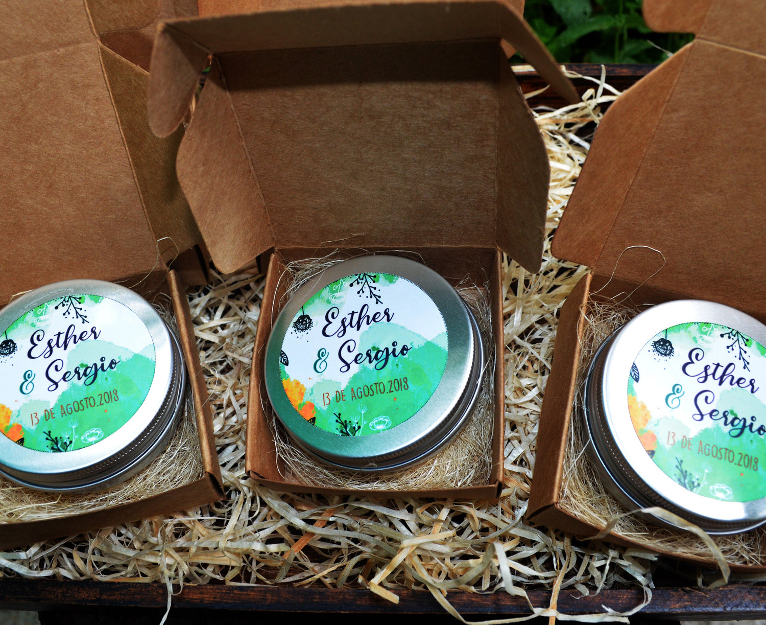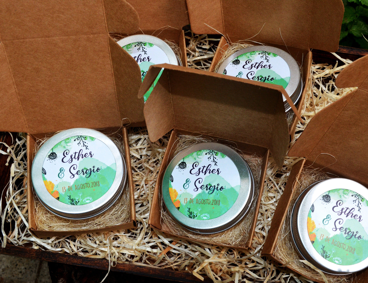 - Se entregan etiquetadas con los nombres y fecha de tu evento y dentro de una cajita kraft, tal como se muestra en la imagen.
