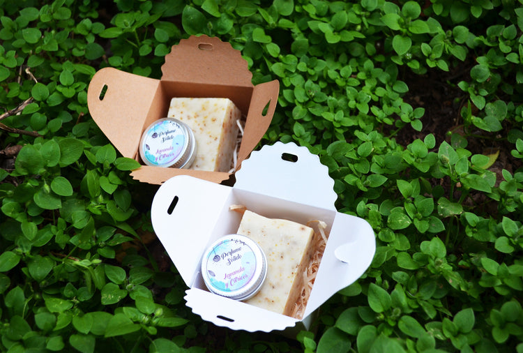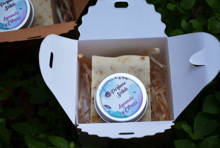 Se entrega en cajita kraft en color blanco o marrón cerrada con lacito y moña. Contiene jabón natural a elegir + perfume sólido etiquetado con el nombre y fecha del evento. Hay diferentes diseños de etiquetas para elegir, elige el diseño que más te guste y no olvides dejarnos un mensaje con los nombres y fecha de tu evento. Cuando tengamos tu etiqueta diseñada, te enviaremos una foto para que nos des tu aprobación.