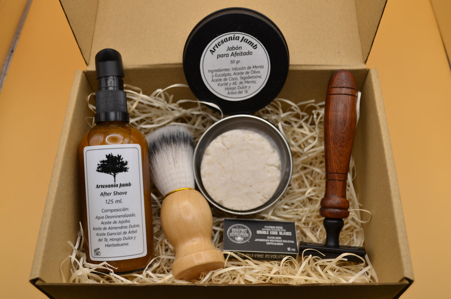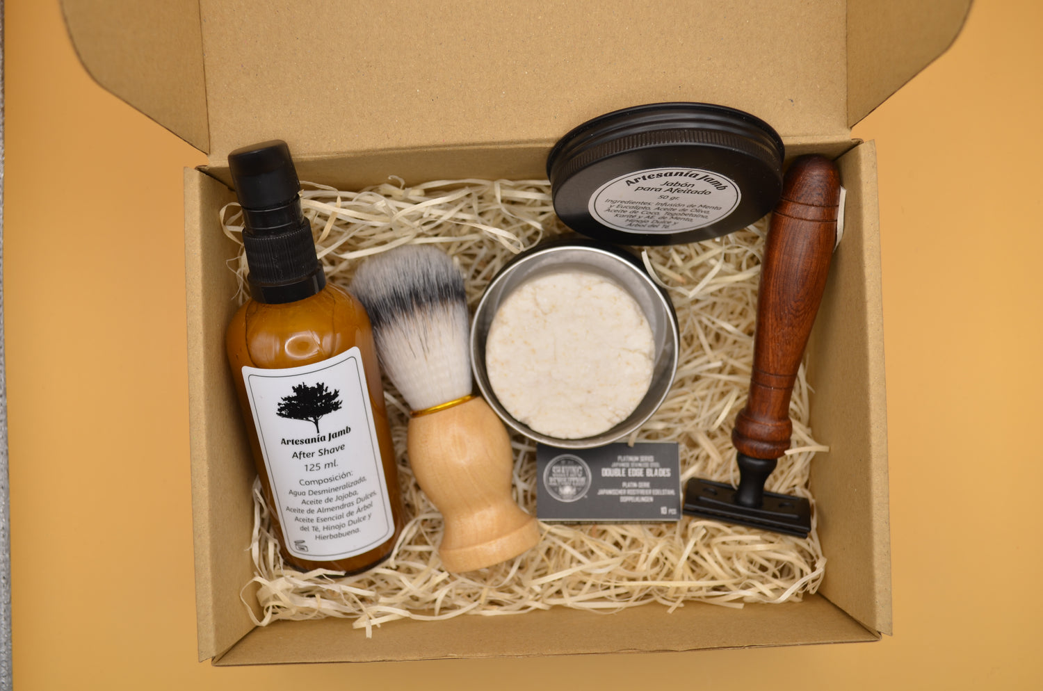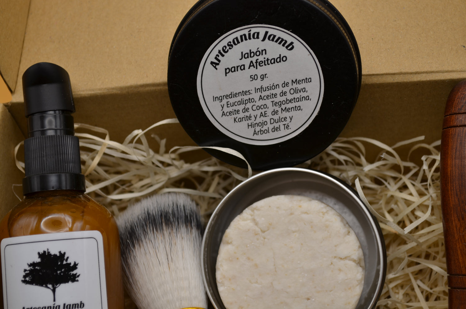 Notre kit de rasage se compose d'un savon naturel à base d'huiles végétales pures et d'une brosse aux poils doux et abondants qui nous aideront à bien faire mousser le savon. Il contient également un après-rasage naturel sous forme d'eau florale, qui nous aidera à cicatriser d'éventuelles coupures et nous procurera un effet très rafraîchissant après le rasage. Le kit comprend également un rasoir traditionnel avec 5 lames de rechange. Le tout est présenté dans un emballage spécial en papier kraft, idéal pour offrir en cadeau. Ce savon à raser se présente en pot de 50 ml. et a une texture douce pour faciliter son application. Parmi ses nombreuses propriétés, on peut souligner qu'il génère une mousse très douce et onctueuse qui gardera la peau parfaitement nourrie, et la fraîcheur qu'elle apporte à la peau grâce aux huiles essentielles qu'elle contient.