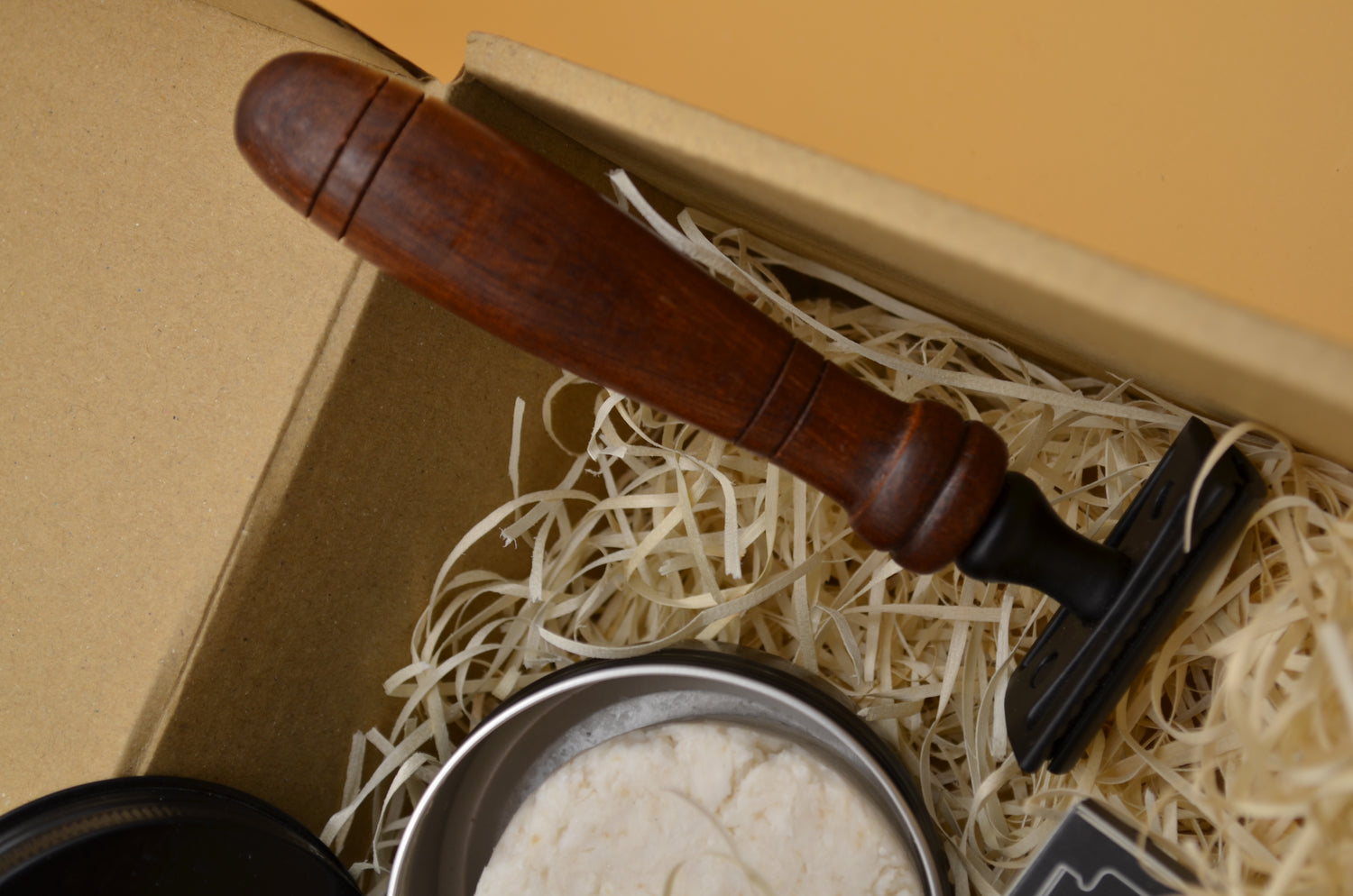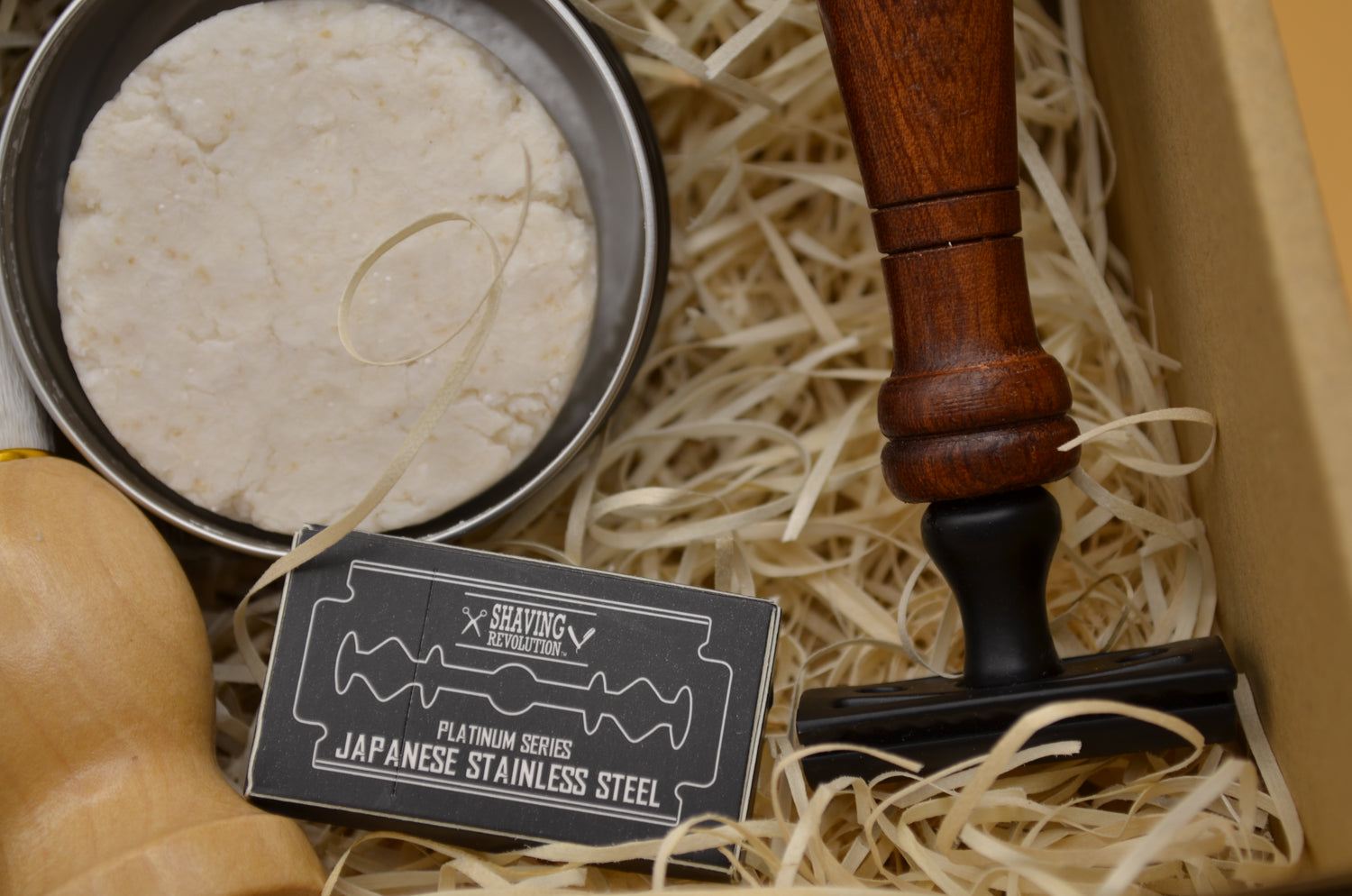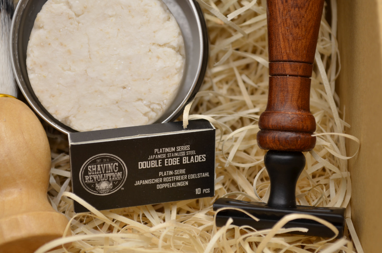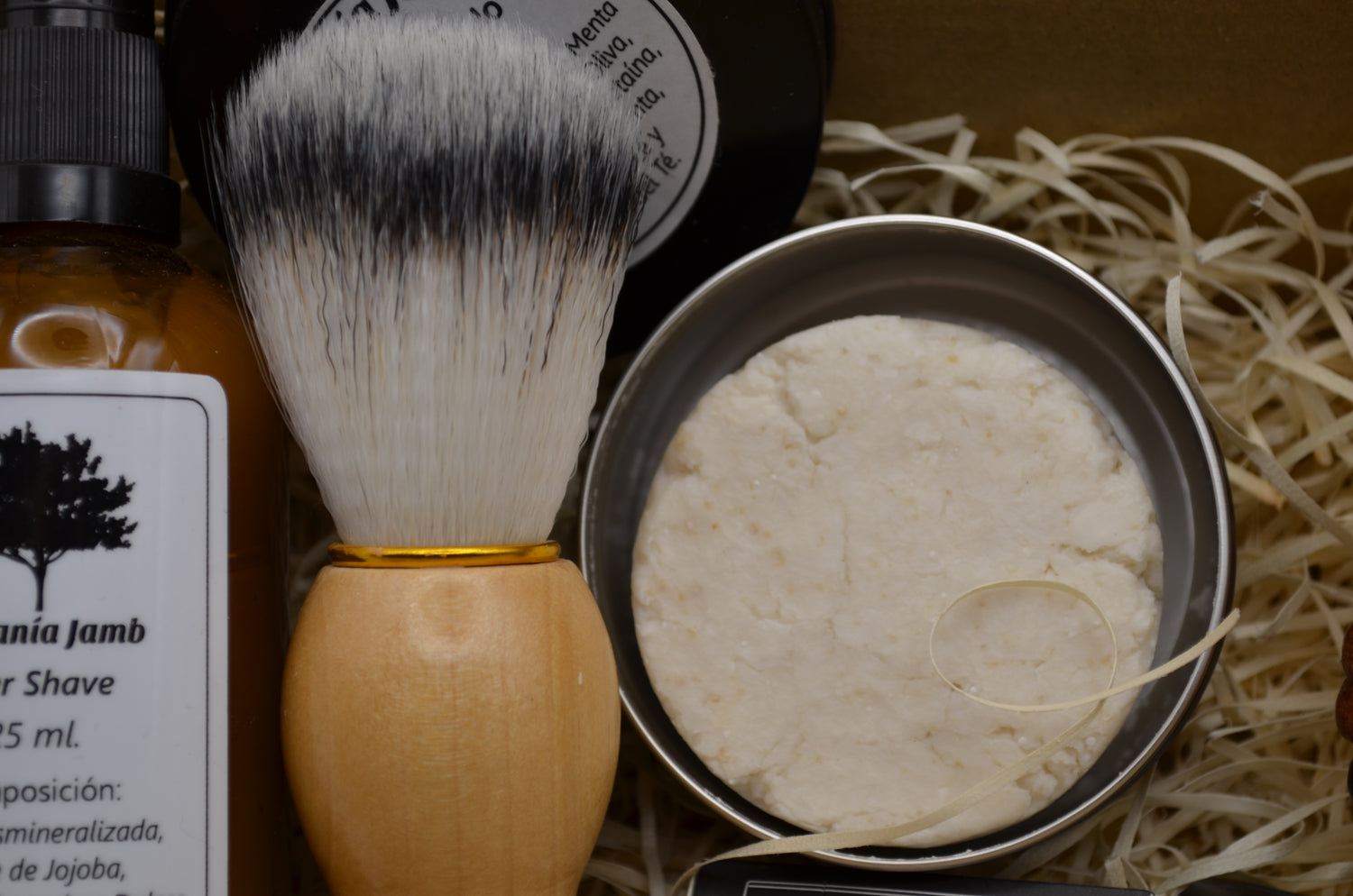 Savon à raser : Infusion de lavande et d'eucalyptus, huile d'olive vierge, huile de coco, beurre de karité, huile essentielle d'arbre à thé, menthe poivrée, eucalyptus et lavande.
